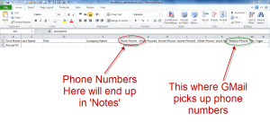- Examine data. You want to make sure that the primary phone number is under the heading ‘Mobile Phone’. By default the Blackberry puts phone numbers in ‘Work Phone’. The Google import tool doesn’t know what to do with this. (See image below). Be sure to manipulate the phone data in excel to put contacts primary phone number under the ‘Mobile Phone’ heading.
