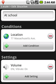 Locale can change your ringer and notification depending on a wide variety of ‘conditions’. So if you are at work or church you can have the phone automatically go on vibrate, or ring loudly at locations where you may miss a call due to ambient noise. You can also set it to change the ringer/notifications based upon time of day, day of week, battery charge level, who is calling or the orientation of the screen.